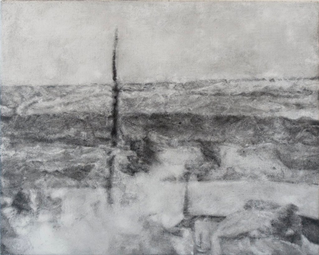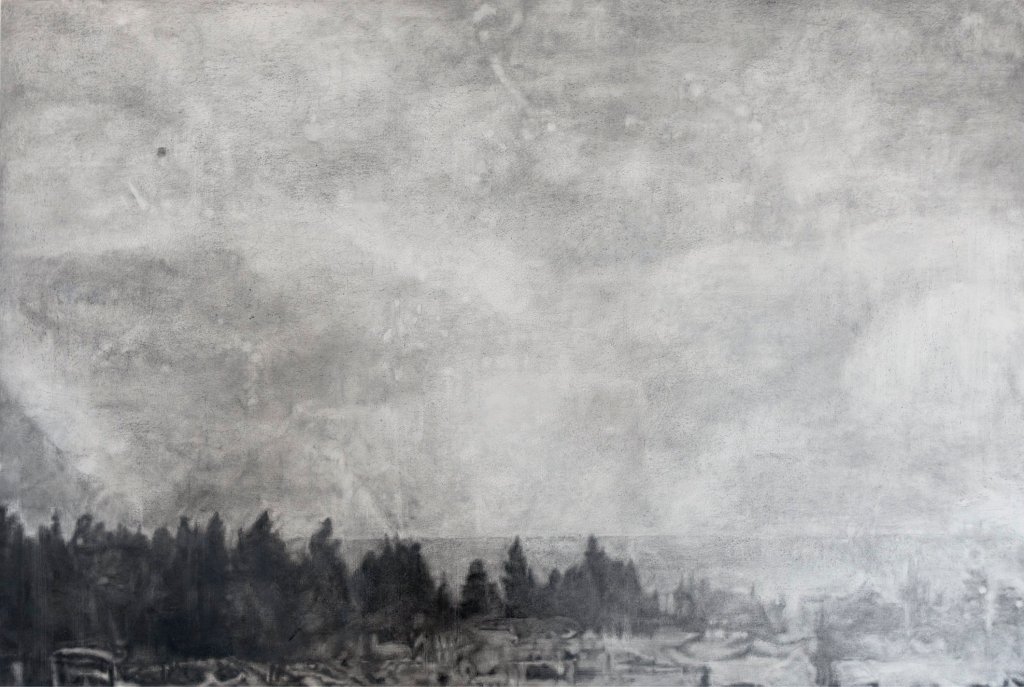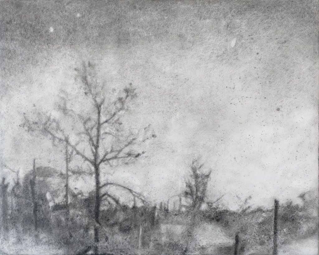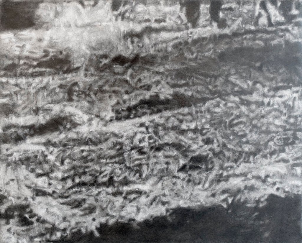 when people came out of the forest there was nothing (2018) is informed by an introverted, acquired awareness of WWII as an indirect afterimage amassed from museums, stories, fictional literature, and cinema. The works in this series are based on selections of landscape backgrounds from found photographic documentation of the Great Patriotic War in Belarus. They are close studies of low-resolution, black and white files, translated into an accumulation of marks, surface, and atmosphere. The found images document instances of historical events and their landscape backgrounds were not intended to be the focus; the selected fragments on which the drawings are based appear to be distant and incomplete.