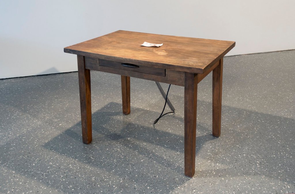 The Rhythm of Anxious Breathing (2019) is a collaborative sound sculpture project with Martin Stevens, consisting of a degraded found photograph set on a reclaimed table. While the photographic image is deteriorated and difficult to discern, it contains elements suggestive of an interior or living space. The photograph resonates with a rhythmic background rumble that was produced by a timeworn, household heating system. The sound is a derived, descriptive model of domestic ambience, isolated and integrated into the physical presence of a melancholic object. This coherence of elements gestures toward an abstracted, dark sense of materiality. The piece is meant to elicit an ambient, sombre and affective experience, reflecting on the constants of the domestic sphere and the circular time of obsessive thought.