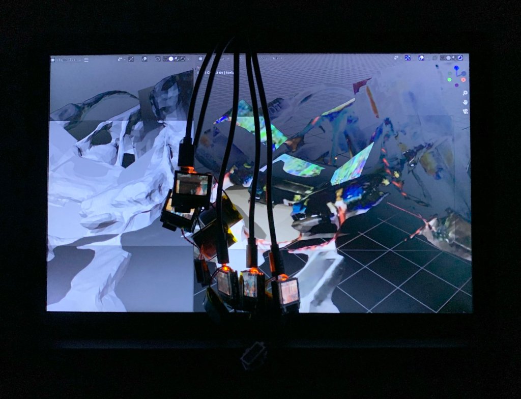 This sculptural video piece refers to the corporeality of the screen. It consists of five TinyCircuits small digital screens and a digital photo frame. The video on the small screens shows zoomed in cropped sections of a blended combination of two found glitches, both accidentally encountered through faulty transmission on televisions in motel rooms. The small screens were 3D scanned and reiterated as a rotating 3D animation, with the glitch video inserted into the 3D model as slices of the moving image. The video on the larger screen is a screen capture that reveals the raw software process of animation, interspersed with the animation itself. The small screens, which have no casings, being positioned overtop the animation video that displays details of software, both reveals and merges the surface of the image with the subface of hardware and computational operations. The sound component for this piece was made by opening a video file as a raw file in Audacity, which resulted in a continuous hissing noise that emanates from the tiny speakers connected to the small screens.