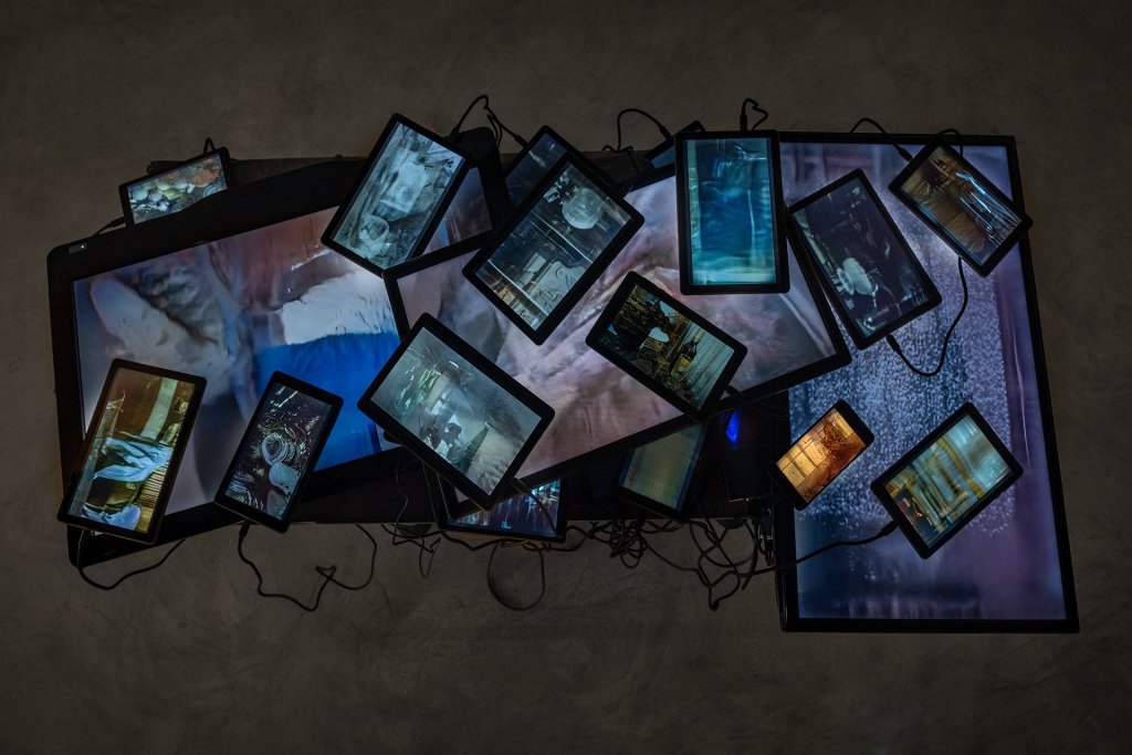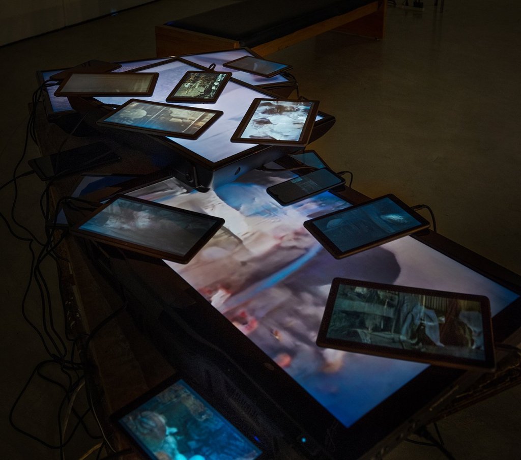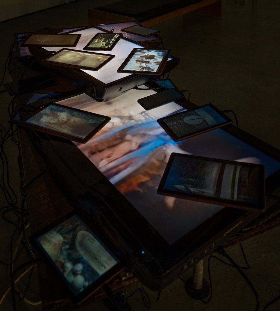 veils into dark places is a video installation consisting of an assemblage of three televisions, two smartphones, and sixteen tablets closely arranged in layers and covering the surface of a found sheet of ruined plywood balanced on a scavenged, weathered steel tube frame. The devices are scattered across the surfaces of the larger screens of the televisions, some balanced against the sides. A multitude of wires powering the installation hangs down from the table, emphasizing the presence of hardware, or the subface, of the devices. On the surface, each screen displays different videos which were generated through machine learning.